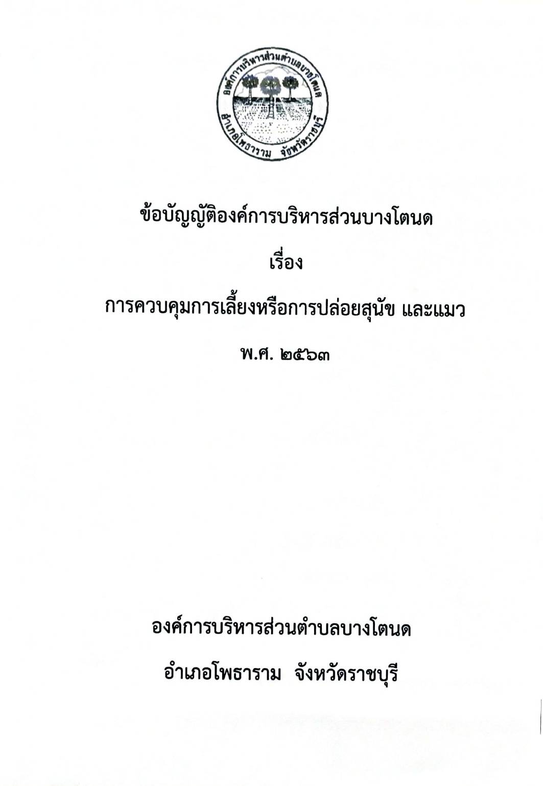 ข้อบัญญัติองค์การบริหารส่วนตำบลบางโตนด เรื่อง การควบคุมการเลี้ยงหรือการปล่อยสุนัข และแมว พ.ศ. 2563